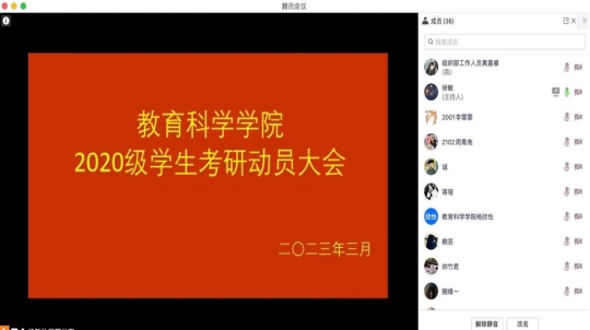 3月6日-9日,教育科学学院分专业召开2020级学生考研动员大会。学院书记左志德、院长邱小健、副书记叶芜为、副院长邓小平出席,就业联络员、年级辅导员、班主任及全体2020级学生参加,本次动员大会以线上线下相结合的方式进行。
