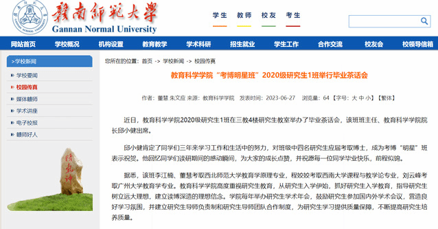 近日,学校官网发表一篇新闻《教育科学学院“考博明星班”2020级研究生1班举行毕业茶话会》,宣传我院研究生教育成效。